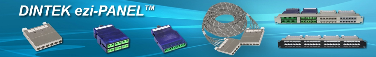 DINTEK's ezi-PANELTM makes configuring multiple topologies easy within one patch panel arrangement. The panels accept either copper and fiber modules, or a mix of both, loaded with or without trunk cable options. Having the option of presenting fiber and copper outlets within one panel offers much more flexibility in the installation. It also can reduce rack space required and provide future proofing.