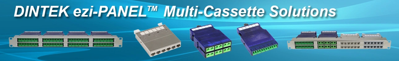DINTEK's ezi-PANELTM makes configuring multiple topologies easy within one patch panel arrangement. The panels accept either copper and fiber modules, or a mix of both, loaded with or without trunk cable options. Having the option of presenting fiber and copper outlets within one panel offers much more flexibility in the installation. It also can reduce rack space required and provide future proofing.